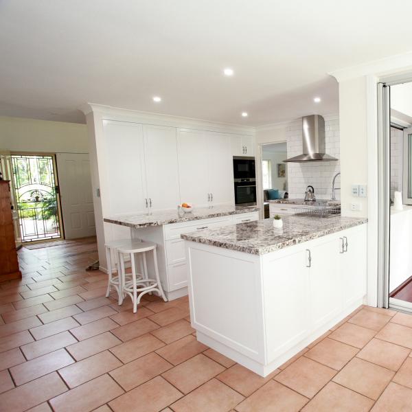 Layout : L shaped white lacquer kitchen cabinet with white island